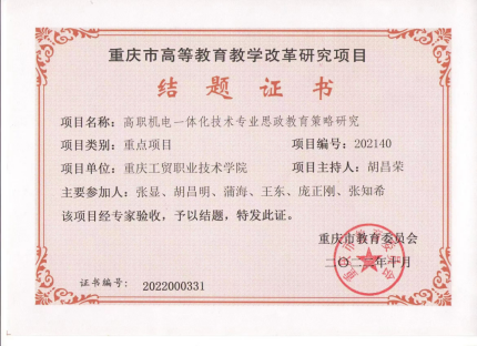 公司开设涉及智能制造领域相关的各专业,包括机电一体化技术、工业机器人技术、机械设计与制造、智能控制技术、工业互联网技术、电气自动化技术、机电设备技术、数控技术等8个专业,其中重庆市市级示范专业1个、重庆市骨干专业1个、重庆市优质高职院校建设专业群1个,与长江师范学院、重庆机电职业技术大学联合开展专本贯通培养专业2个。先后成为全国高等学校“机器人+”产教融合基地培育建设单位、重庆市创新教育学会产教融合专业委员会副理事长单位、重庆工业设计职业教育集团常务理事单位。现有全日制在校生1900余人,专职教师43人,其中教授2人,副教授12人,讲师13人,全国机械职业公司产品指导委员会基础制造技术专业指导委员会委员1人,全国标准化技术委员会委员2人,区级优秀教师2人、区级学科带头人1人,双师型教师25人,主持有重庆市精品视频公开课、重庆市线上线下混合式一流课程和重庆市市级精品课程各1门。同时聘请了30余名企业实践专家和能工巧将作为兼职教师。学院建成1+X证书考点2个(数控车铣加工、可编程控制器系统应用编程),面向在校生及社会人员开展技能培训、考核,承担企业员工技能提升培训项目。整体办学水平处于同类院校前列。