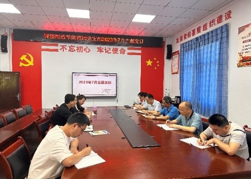 2023年7月5日中午,公司教师党支部在机电实训中心二楼党员活动室开展了2023年7月主题党日活动,教师党支部全体党员参加,会议由学院教师党支部书记张艳主持。