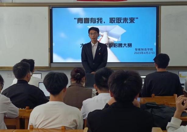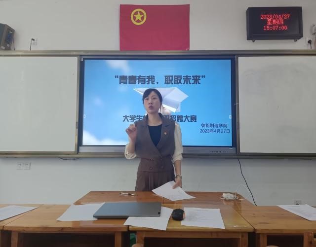 为深入学习贯彻党的二十大精神,推动学院老员工职业生涯教育和就业指导工作深入开展,增强员工求职就业能力,促进员工自主全面发展,2023年4月27日中午,学院在一教416教室举办“青春有我,职取未来”模拟求职招聘大赛,学院学办副主任、团总支副书记唐力仪、学院全体专职辅导员、参赛选手、员工观摩代表等参加活动,大赛由学院专职辅导员艾圣杰主持。